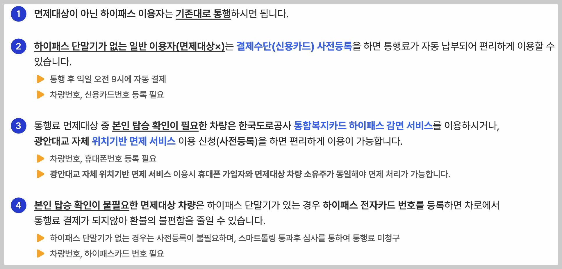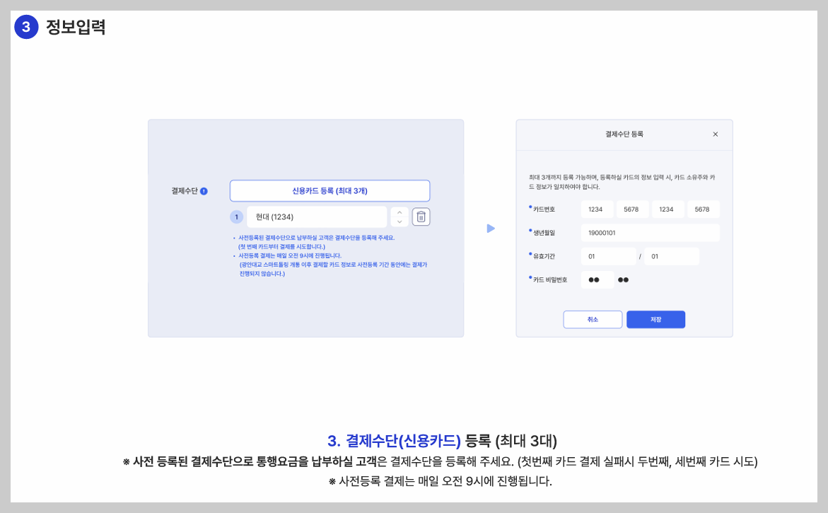 - 자동결제 시작: 등록 완료 후 매일 오전 9시에 통행료가 자동 결제됩니다.