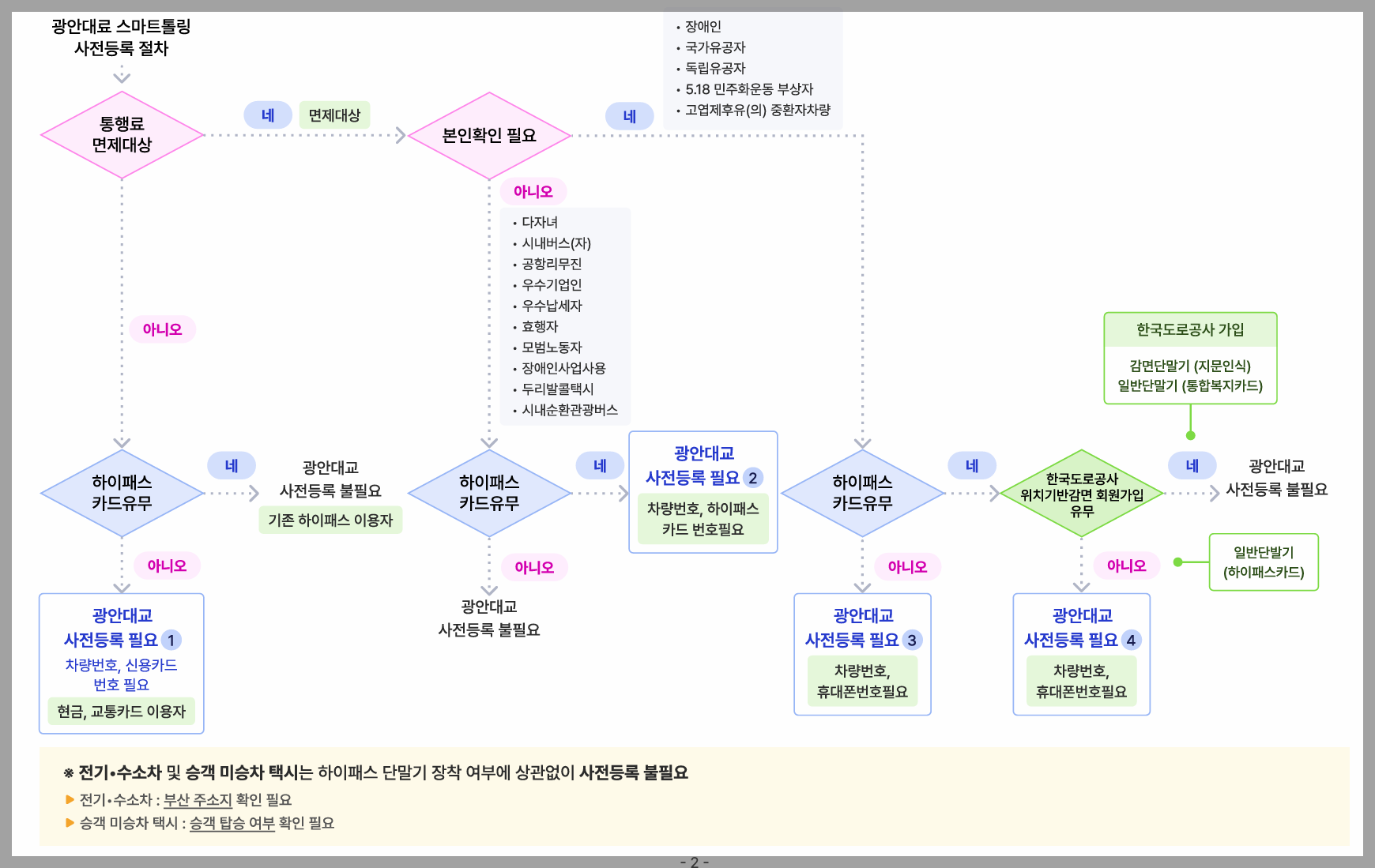 - 장애인, 친환경 차량, 다자녀 가구 차량 등은 등록 후 증빙 서류를 제출하면 통행료 면제가 가능합니다. 자세한 내용은 광안대교 홈페이지를 참고하세요.