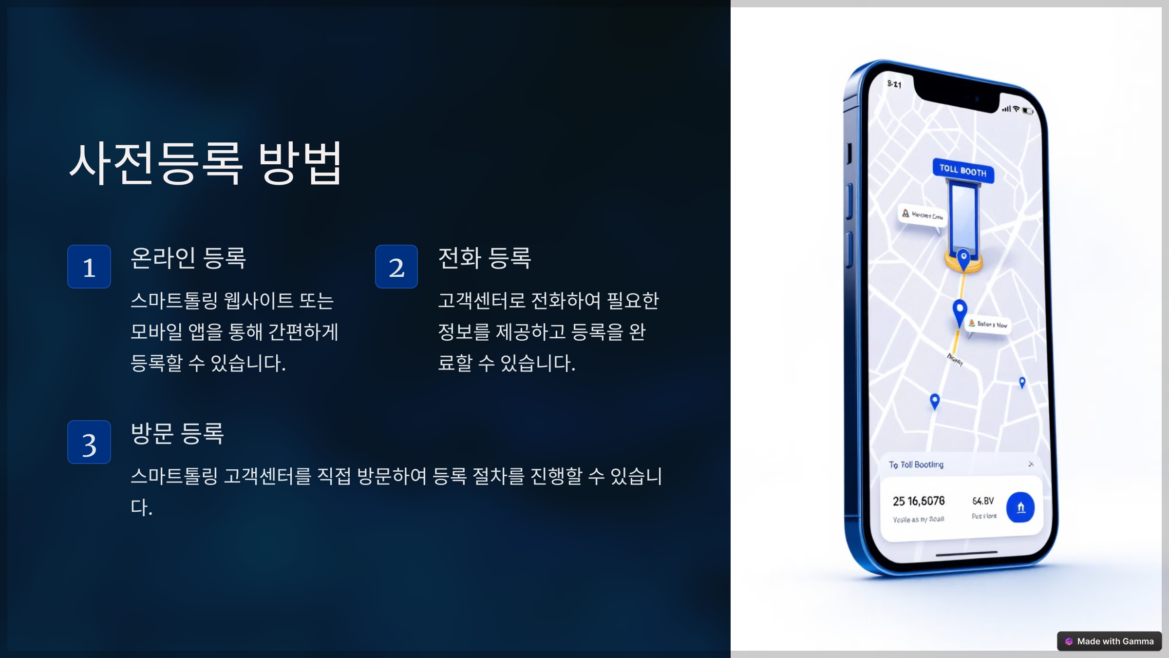 스마트톨링은 광안대교를 통행하는 모든 운전자에게 더 나은 주행 환경을 제공합니다. 사전등록은 간단하며, 미리 준비하면 통행료 미납 걱정 없이 편리하게 도로를 이용할 수 있습니다.