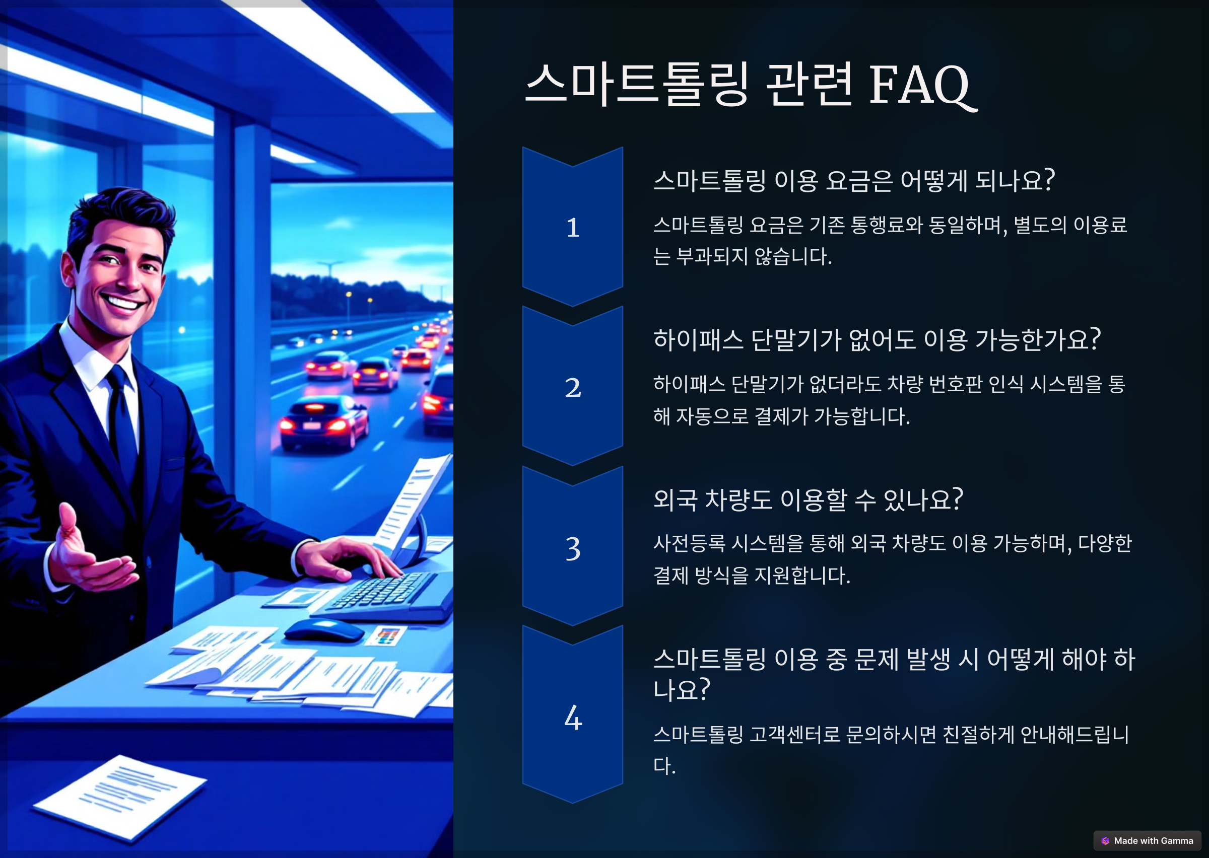 - 네, 스마트톨링 도입 후에도 통행료 요금은 기존과 동일하게 유지됩니다.