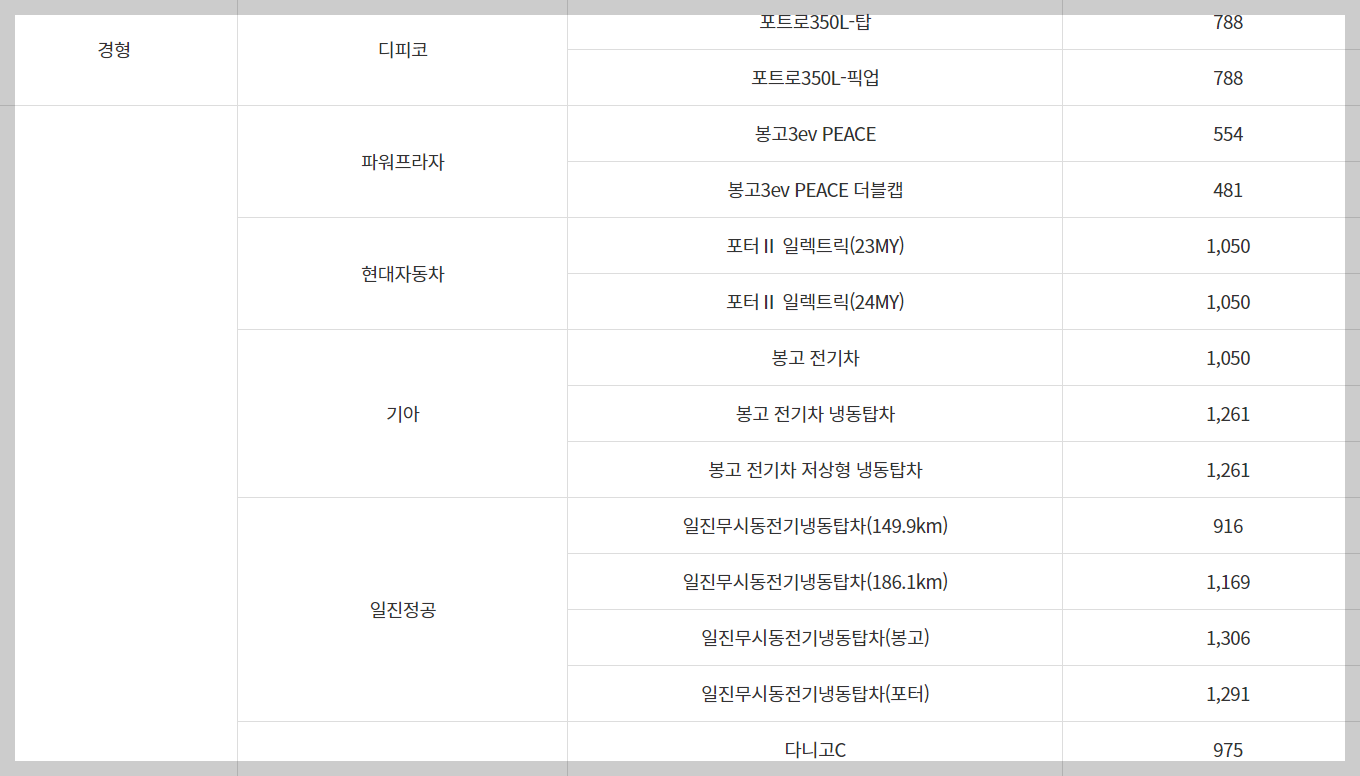 전기화물 중 포터Ⅱ 일렉트릭 1050만 원, 봉고 전기차 냉동탑차 1261만 원이고 전기승합에서는 카운티 일렉트릭 3915만 원