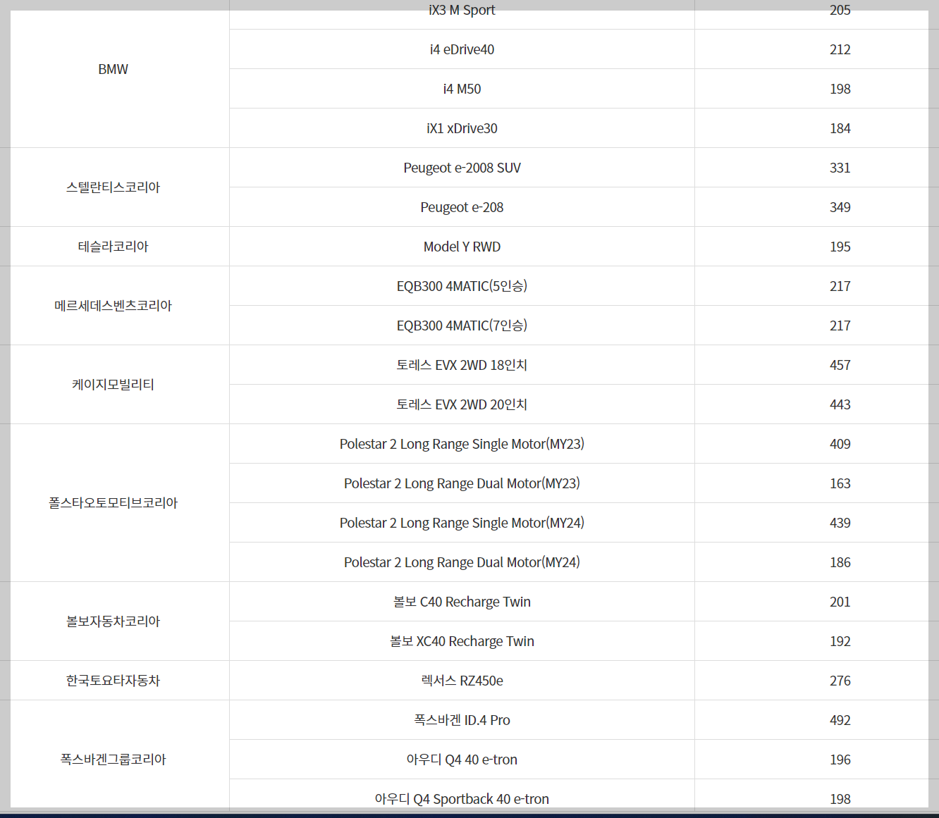 3. 외제차 중에서는 테슬라 ‘model Y RWD’ 195만 원, 폭스바겐 ‘ID.4 Pro’ 492만 원, 아우디 “Q4 Sportback 40 e-tron’ 198만 원, BMW ‘I4 eDrive 40’ 212만 원, 벤츠 ‘EQB 300 4 MATIC’ 217만 원, 도요타 렉서스 RZ450e 276만 원