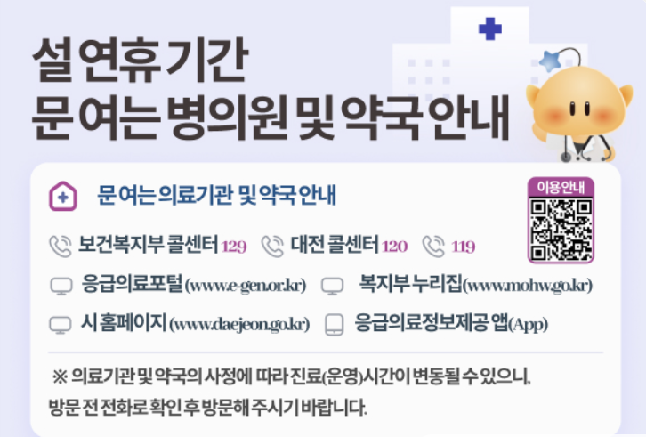 대전시는 설 연휴 동안 운영하는 병원과 약국 리스트를 공식적으로 제공합니다.