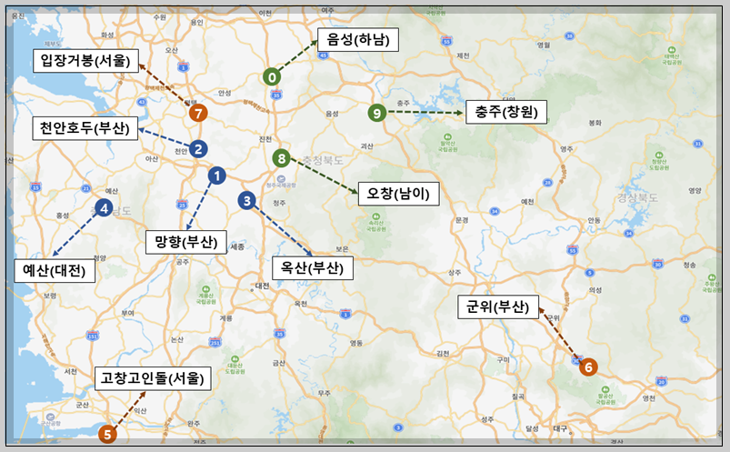 망향(부산), 천안호두(부산), 옥산(부산), 예산(대전), 고창(서울), 군위(부산), 입장거봉포도(서울), 오창(남이), 충주(창원), 음성(하남)