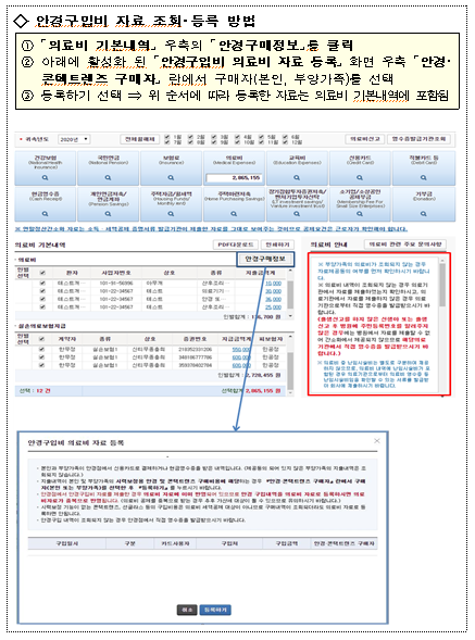 - 공제 대상 항목(시력교정용 안경, 콘택트렌즈)만 선택해 등록