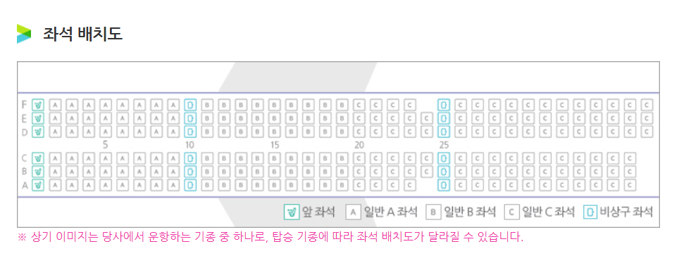 항공기의 좌석 배치도가 표시됩니다. 원하는 좌석을 클릭하여 직접 선택할 수 있으며, 비상구 좌석이나 프리미엄 좌석의 경우 추가 비용이 발생할 수 있습니다.