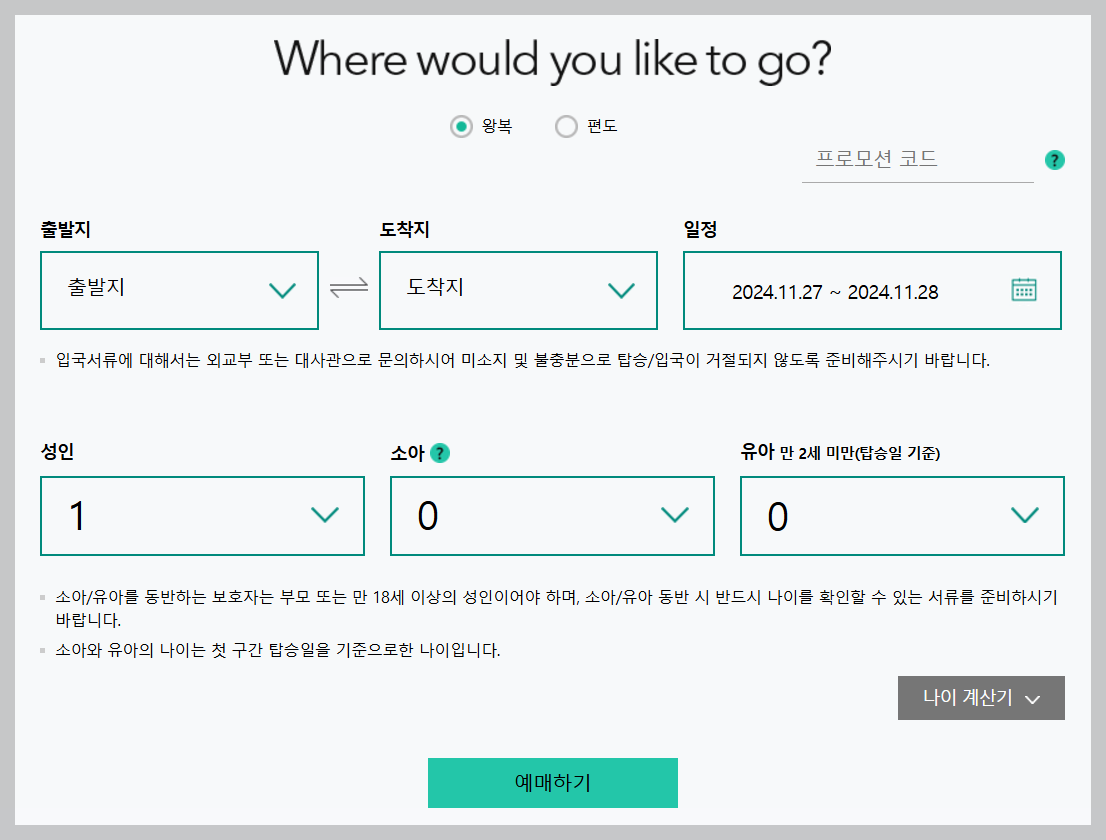 - 날짜 및 인원 선택: 왕복 또는 편도, 탑승 인원을 입력하세요.