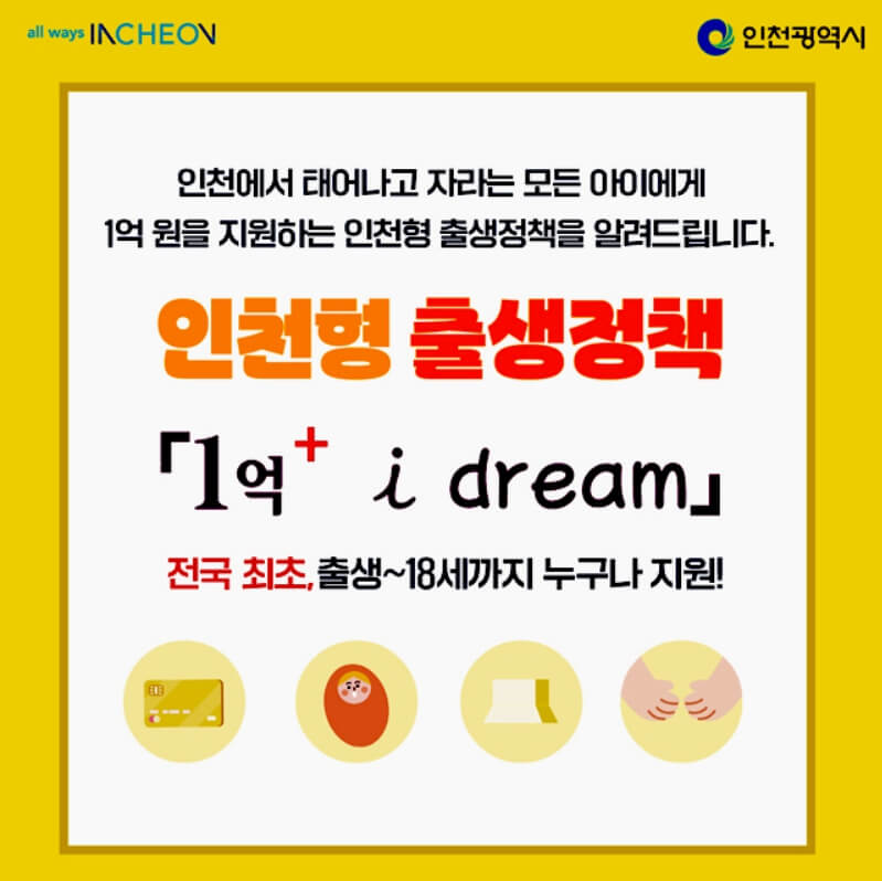 인천형 출산 정책으로 인천에서 태어난 아기가 받을 지원금 종류와 인천 1억 플러스 아이드림 정책에 대하여 알아보겠습니다.