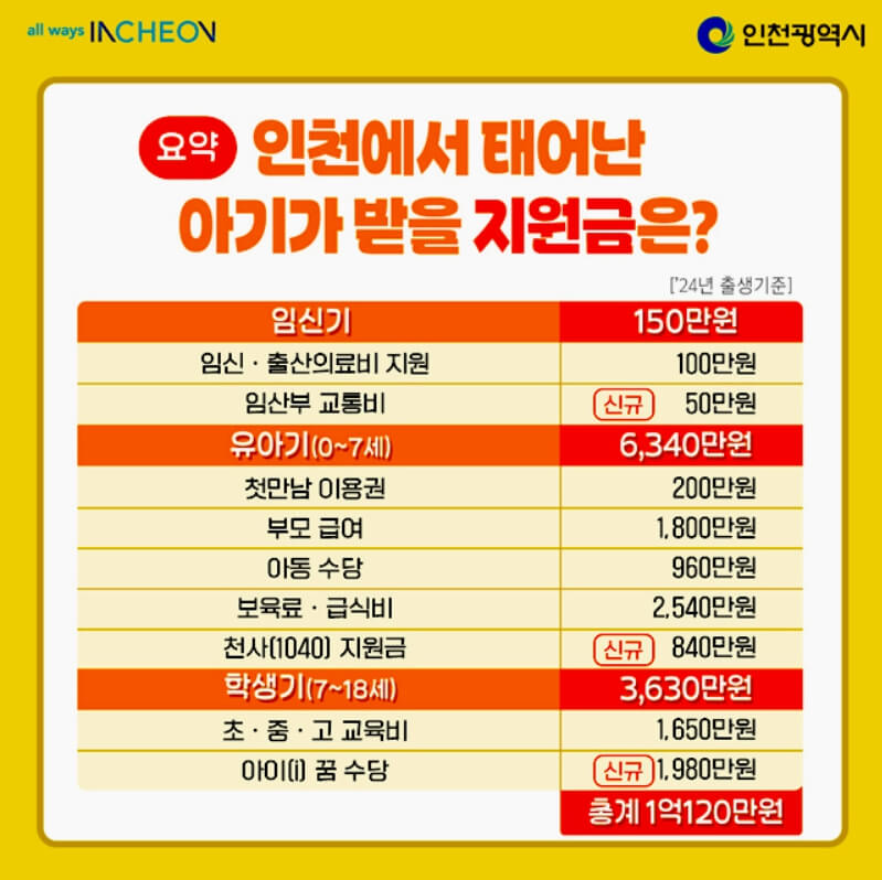 임신기 (150만 원)부터 시작하여 유아기(6,340만 원)와 학생기(3,630만 원) 동안 인천에서 태어난 아기가 받을 수 있는 인천형 출산정책의 총 지원 금액은 1억 120만 원입니다.