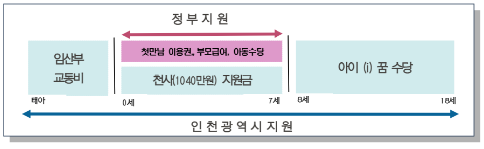 천사지원금(840만원), 아이(i) 꿈 수당(1,980만 원), 임산부 교통비(50만 원) 등 총 2,800만 원을 추가하여 인천에서 태어난 모든 아이에게 1억원 지원함.