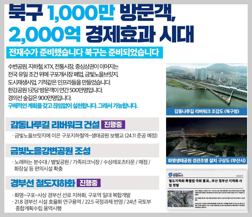 수변공원, 지하철, KTX, 전통시장, 중심상권이 이어지는 전국 유일 조건 위에 구포개시장 폐업, 금빛노을브리지, 도시재생사업, 기적 같은 인프라들을 만들었습니다.