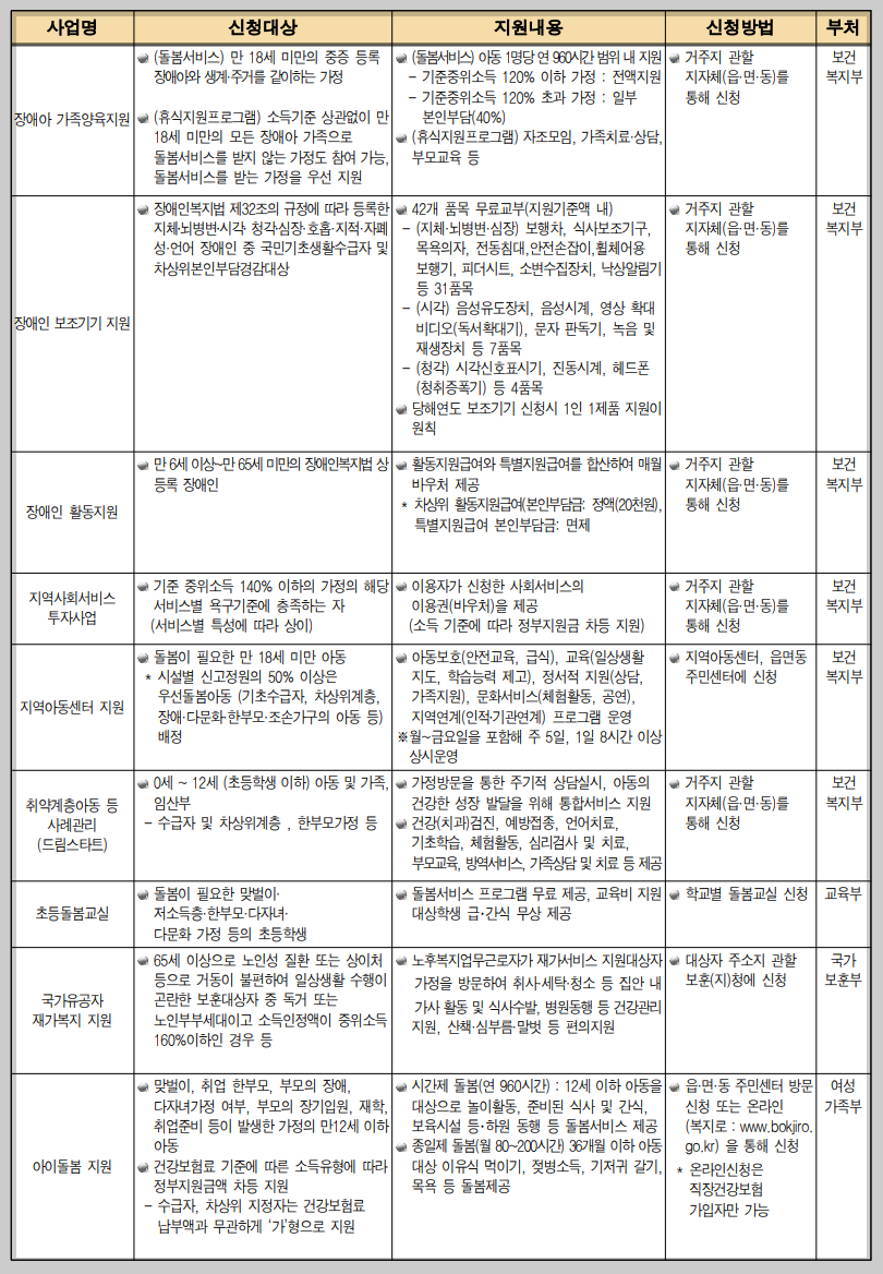 - 돌봄서비스 : 만 18세 미만의 중증 등록 장애아와 생계·주거를 같이하는 가정