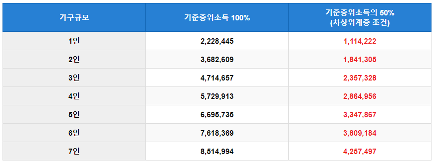 - 공공기관 보유자료, 지자체 및 지역단위 민간자원을 활용하여 조사된 대상자 중 소득인정액이 기준중위소득의 50% 이하인 가구