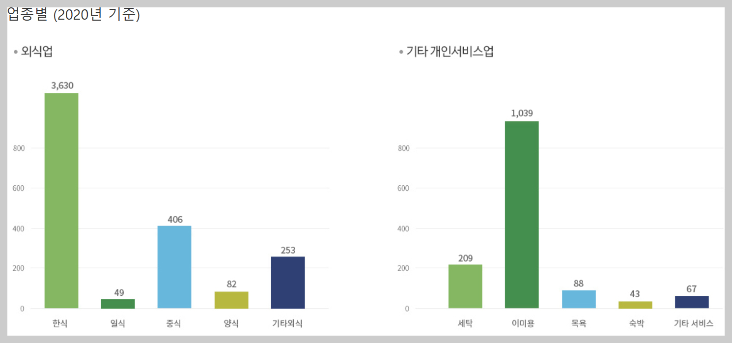 2. 2023년 12월 기준으로 한식·일식·중식·양식 등 외식업 5,257개, 세탁·이용·미용·목욕업 등 외식업 이외 업종 1,808개 등 국민의 수요가 높은 업종을 중심으로 전국적으로 7,065개소가 지정‧운영 중에 있습니다.