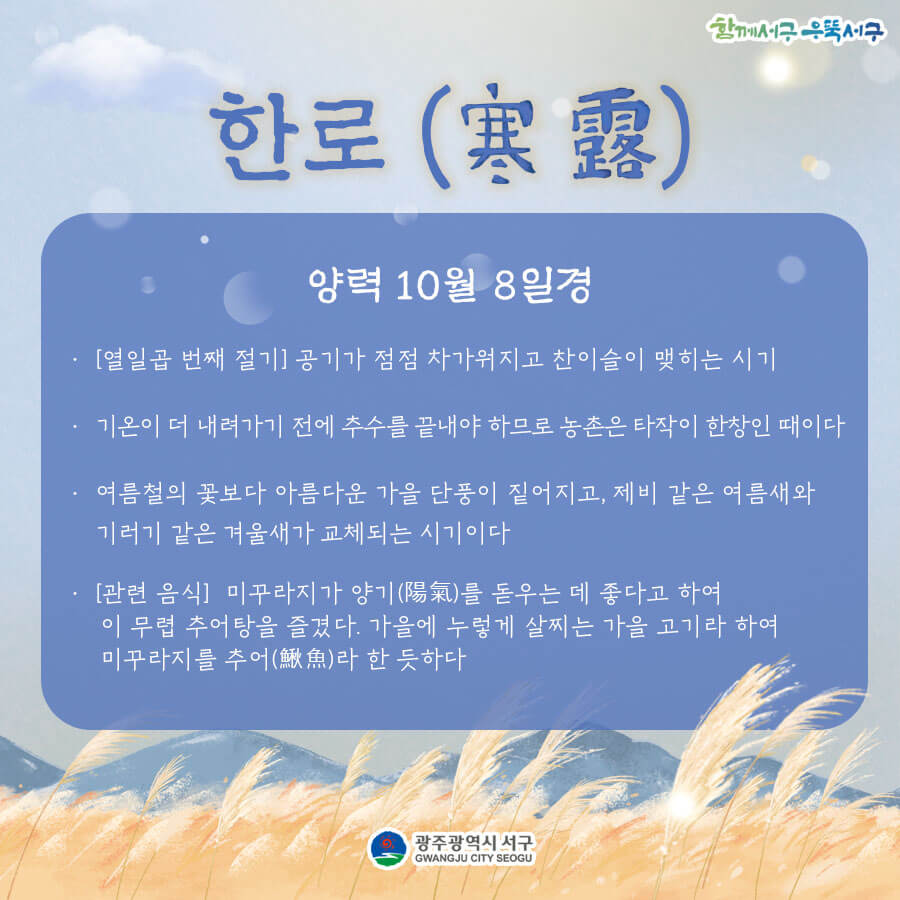 양력으로 매년 10월 8일에서 9일 사이에 해당하는 시기입니다. 이 무렵, 아침저녁으로는 더욱 쌀쌀한 날씨를 경험할 수 있어 가을이 한층 깊어졌음을 실감하게 됩니다.