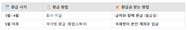 - 회사는 근로자의 급여일에 맞춰 환급금 지급 (보통 3월~4월)