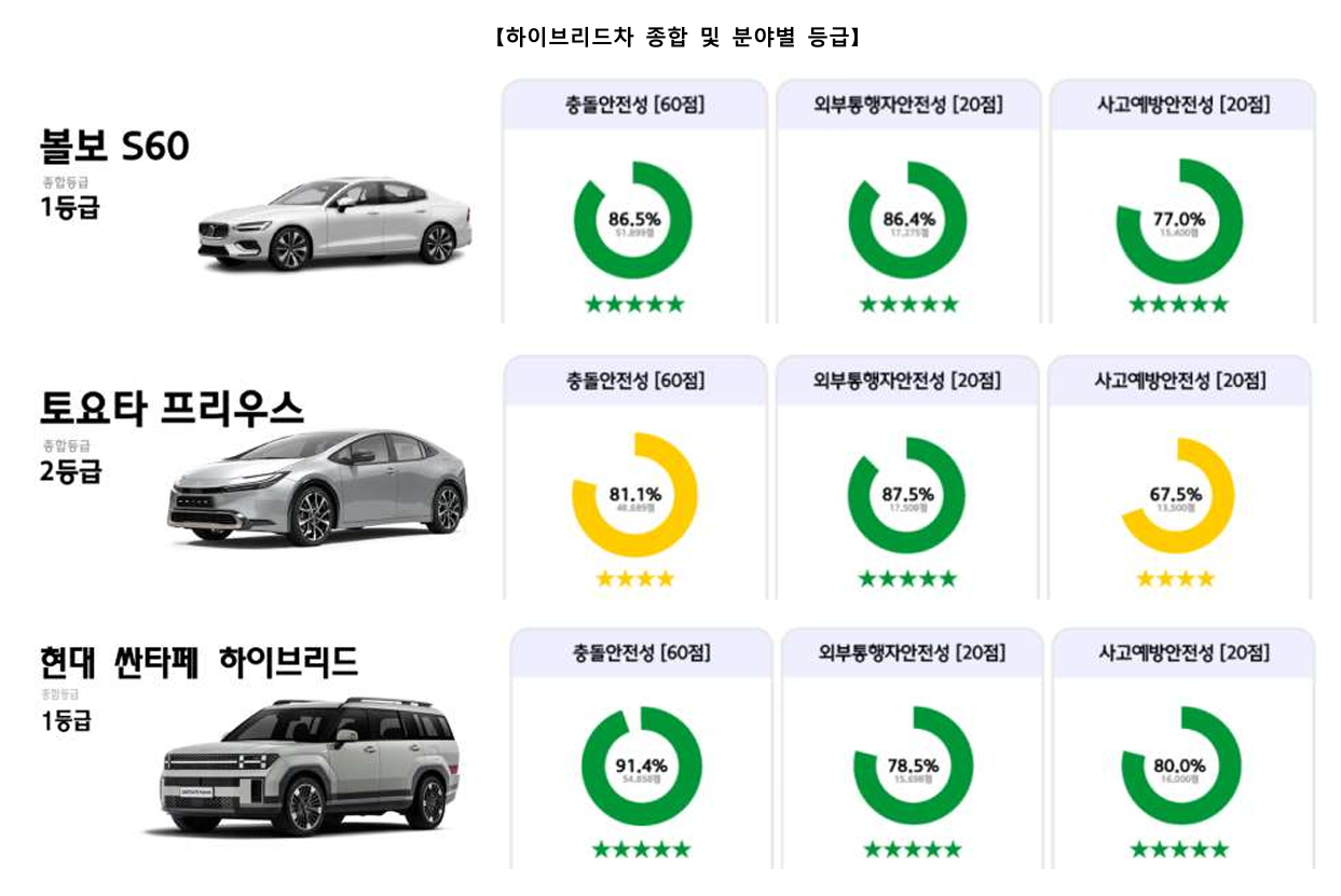하이브리드차는 현대 싼타페 하이브리드와 볼보 S60이 높은 안전성을 인정받아 각각 1등급을 차지했습니다. 이외에 토요타 프리우스는 2등급으로 평가되며 균형 잡힌 안전성을 보여주었습니다.