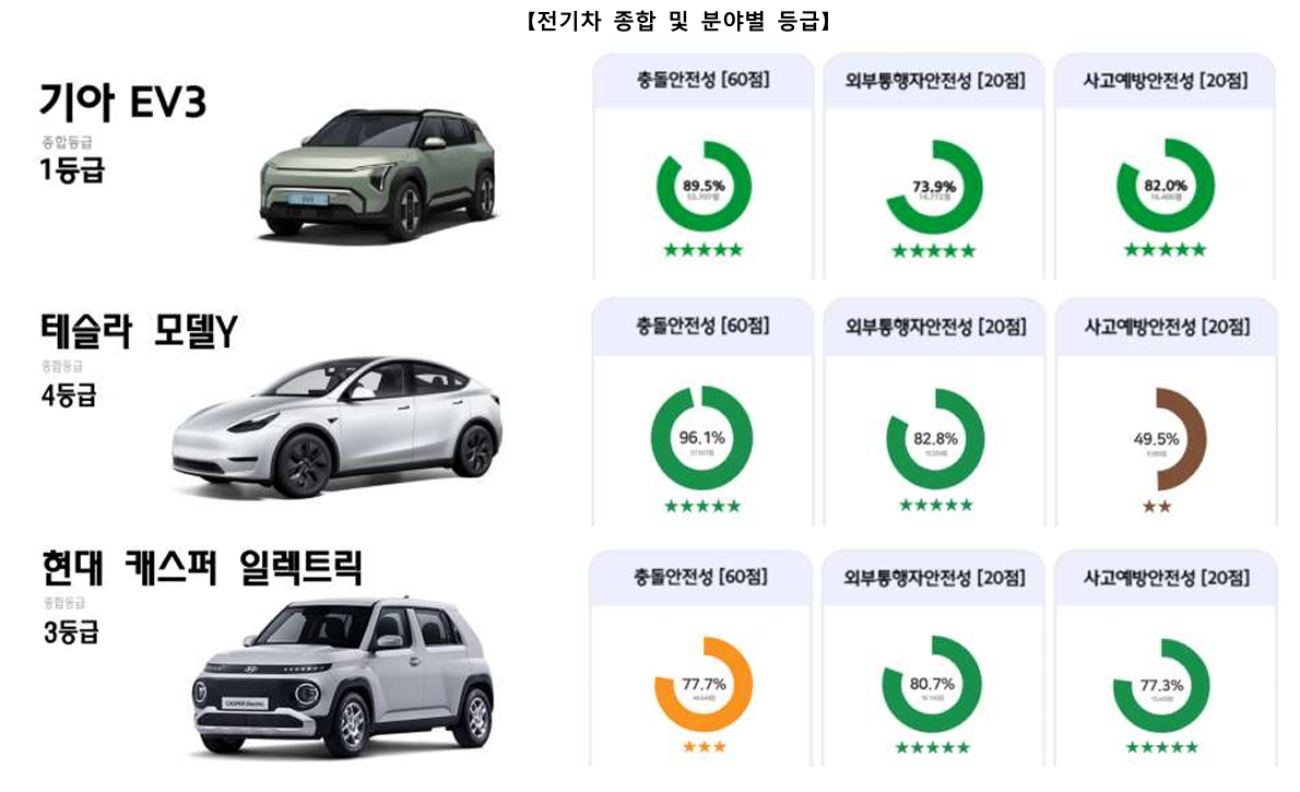전기차 중 기아 EV3는 충돌 안전성(53.707점), 외부 통행자 안전성(14.772점), 사고 예방 안전성(16.400점) 등에서 고르게 높은 점수를 획득하며 종합등급 1등급을 차지했습니다.