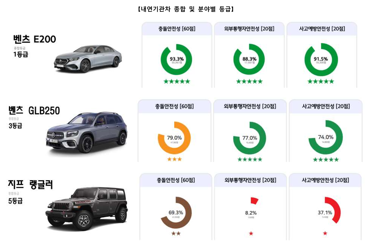 - 충돌 안전성: 기아 EV3, 벤츠 E200, 현대 싼타페 하이브리드가 85% 이상의 점수로 최고 등급을 기록했습니다.