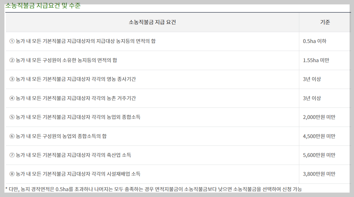 - 요건 : 아래의 요건을 모두 충족한 농가에게 소농직불금을 지급합니다.
