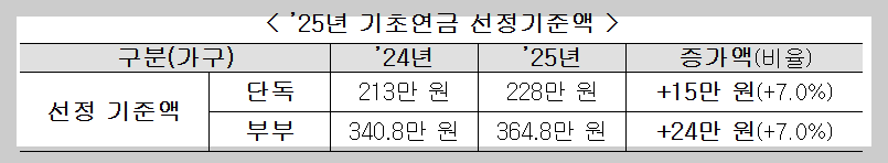 2025년 기초연금 선정 기준액은 전년도보다 증가하여 단독 가구는 15만 원, 부부 가구는 24만 원이 추가되었습니다.