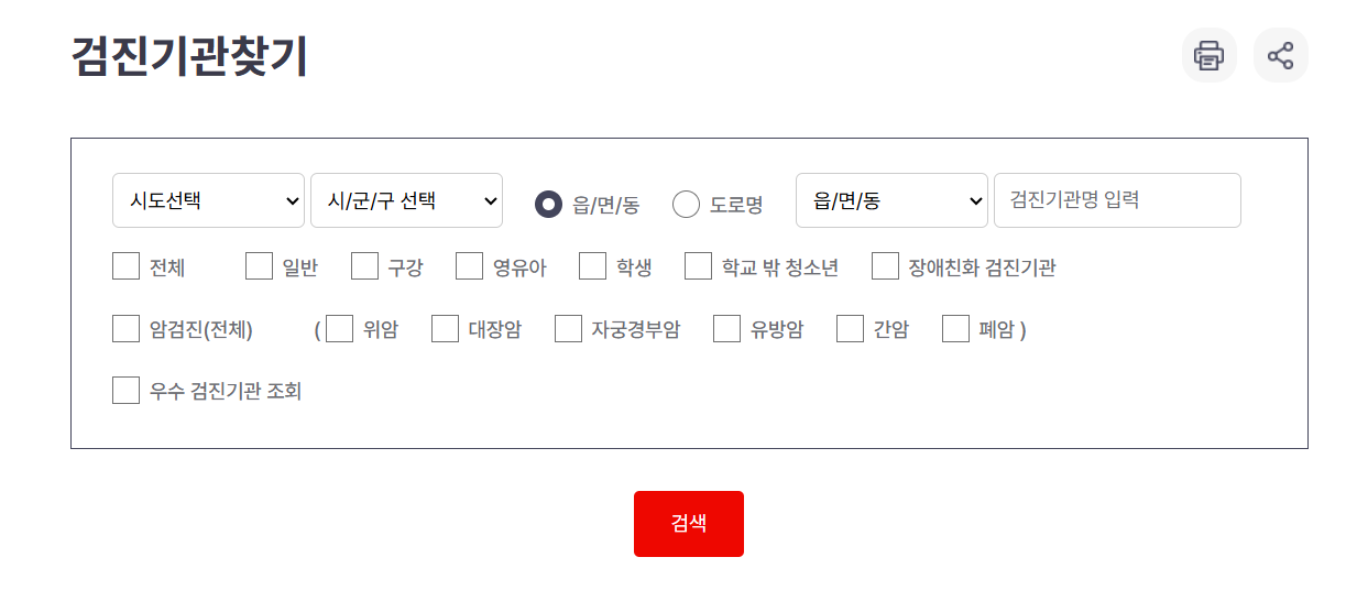 3️⃣ 지역과 병원 종류를 입력하면 근처 검진 병원 목록이 나옵니다.